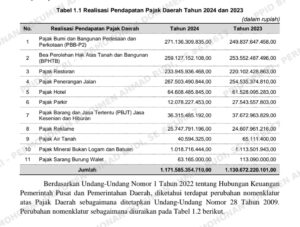 Laporan Realisasi Anggaran (LRA) Pemerintah Kota Palembang Tahun 2024 menyajikan anggaran Pendapatan Pajak Daerah sebesar Rp1.154.968.000.000,00 dengan realisasi sebesar Rp1.171.585.354.710,00 atau 101,44% dari anggaran.