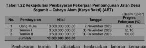 Pekerjaan tersebut dilaksanakan selama 63 hari kalender mulai tangga l30 Oktober s.d. 31 Desember 2023, dengan nilai kontrak sebesar Rp10.000.000.000,00. Pekerjaan tersebut telah dibayarkan seluruhnya atau 100% dari nilai kontrak per 31 Desember 2023, dengan rincian pada Tabel 1.22.