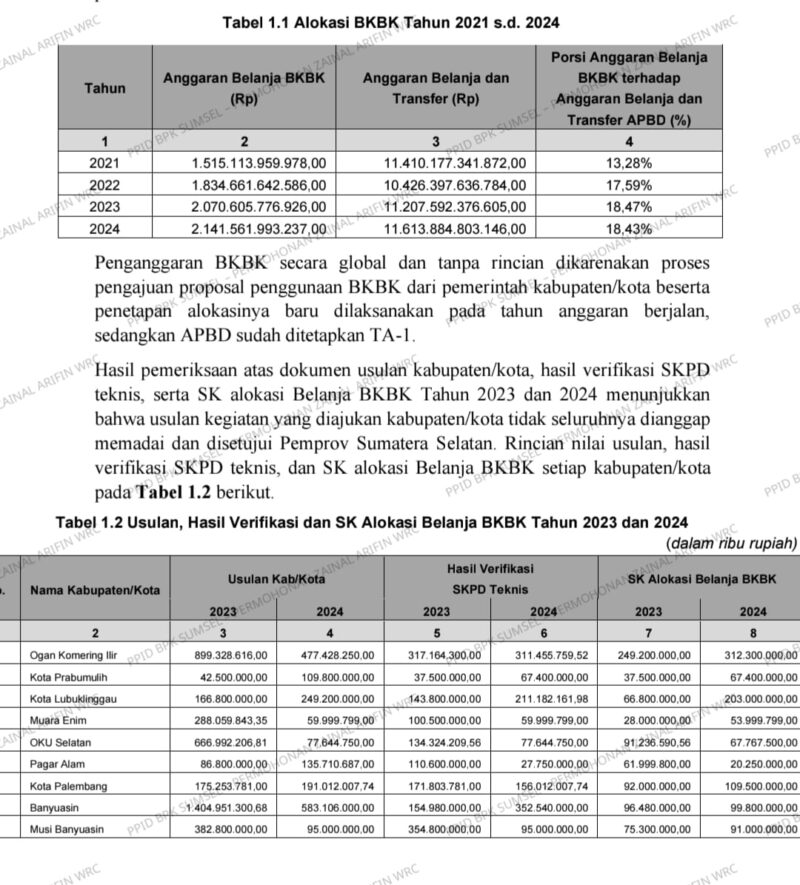 Dalam LHP Nomor 44/LHP/XVIII.PLG/05/2024 tanggal 11 Mei 2024 atas Laporan Keuangan Pemprov Sumsel Tahun 2023 mengungkap penganggaran Lain-lain Pendapatan Asli Daerah (PAD) yang Sah tidak didasarkan pada potensi riil,penganggaran BKBK membebani keuangan daerah, dan rendahnya kemampuan keuangan untuk mengembalikan kewajiban.