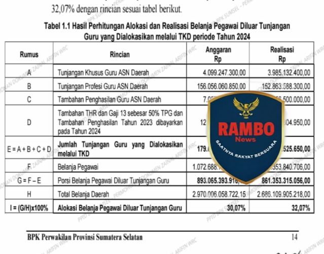 Berdasarkan ketentuan tersebut, hasil perhitungan Belanja Pegawai diluar tunjangan guru yang dialokasikan melalui TKD pada Laporan Keuangan Pemerintah Kabupaten Banyuasin Tahun 2024 diperoleh porsi alokasi sebesar 32,07% dengan rincian sesuai tabel berikut