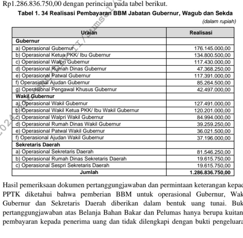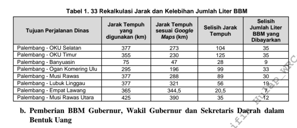 Rekalkulasi BPK Sumsel_01/07/2024/236/WRC/DIV II/Sumsel/VI/2024/Zainal Airifin Hulap_WRC-PANRI jarak dan kelebihan jumlah liter BBM yang diberikan disajikan pada tabel berikut.Pemberian BBM Gubernur, Wakil Gubernur dan Sekretaris Daerah dalam Bentuk Uang SK Gubernur Sumsel Nomor 5/KPTS/VIII/2023 tentang Pemberian Bahan Bakar Minyak kepada Pejabat Pemegang Kendaraan Dinas milik Pemerintah Provinsi Sumatera Selatan dan Petugas Pengawalan dari Kepolisian Daerah Sumatera Selatan mengatur bahwa Gubernur dan Wakil Gubernur (Wagub) berhak mendapatkan BBM sebanyak 30 liter/hari, Sekretaris Daerah (Sekda) sebanyak 25 liter/hari, Rumah Tangga Gubernur, Wagub dan Sekda sebanyak 5 liter/hari, Pengawalan Gubernur dan Wagub sebanyak 10 liter/hari.