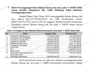 Bukti Pertanggungjawaban Belanja Barang dan Jasa pada 11 SKPD Tidak Sesuai Kondisi Sebenarnya dan Tidak Didukung Bukti Dokumen Pertanggungjawaban Pemkab Muara Enim Tahun 2024 menganggarkan Belanja Barang dan Jasa sebesar Rp1.143.729.958.590,55 dan telah direalisasikan sebesar Rp997.240.572.419,55 atau 87,19% dari anggaran. Realisasi tersebut di antaranya merupakan realisasi Belanja Barang dan Jasa pada 11 SKPD dengan rincian sebagai berikut.