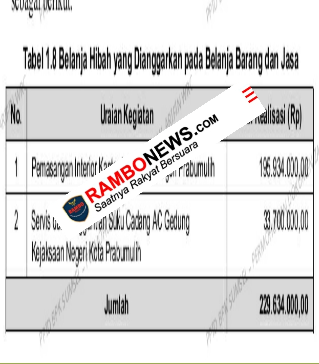 Kegiatan Belanja Hibah Dianggarkan pada Belanja Barang dan Jasa pada Sekretariat Daerah Sebesar Rp229.634.000,00 Hasil pemeriksaan atas realisasi Belanja Barang dan Jasa sebesar Rp314.308.023.564,46 diketahui bahwa terdapat belanja pemasangan interior dan pemasangan suku cadang AC untuk Kejaksaan Negeri Kota Prabumulih sebesar Rp229.634.000,00.