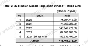 Dalam Penatausahaan Perjalanan Dinas PT Muba Link Tidak Memadai Dalam mendukung pelaksanaan kegiatan operasionalnya, untuk periode Tahun 2020 s.d. 2024 (Semester I) PT Muba Link merealisasikan Beban Perjalanan Dinas sebesar Rp418.469.372,00 dengan rincian sebagai berikut.