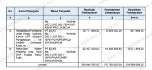 5) Pekerjaan Rehabilitasi/Pembangunan Pagar Gedung Kantor UPT (Sistem Pengelolaan Air Limbah Domestik Kelas A) yang dilaksanakan PT DCKB sebesar Rp887.850,00;