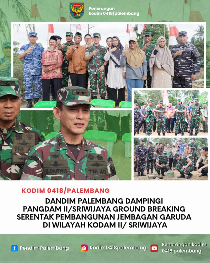 Komandan Kodim 0418/Palembang, Letkol Arh Erik Novianto, S.Sos., mendampingi Pangdam II/Sriwijaya Mayjen TNI Ujang Darwis, M.D.A., dalam kegiatan ground breaking pembangunan jembatan beton Tahap IV yang dilaksanakan secara serentak di seluruh jajaran Kodam II/Sriwijaya, Kamis (26/03/2026).
