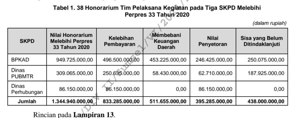 Atas kelebihan pembayaran honorarium melebihi Perpres Nomor 33 Tahun 2020 sebesar Rp833.285.000,00 tersebut telah ditindaklanjuti dengan penyetoran ke Rekening Kas Umum Daerah Pemprov Sumsel sebesar Rp395.285.000,00 sehingga sisa kelebihan pembayaran yang belum ditindaklanjuti sebesar Rp438.000.000,00 (Rp833.285.000,00 –Rp395.285.000,00) dengan perincian pada tabel berikut.Pembayaran Honorarium Tim Pelaksana Kegiatan Tidak Sesuai Ketentuan pada Tiga SKPD Dalam Perpres 33 Tahun 2020 tentang Standar Harga Satuan Regional, Honorarium Tim Pelaksana Kegiatan dan Sekretariat Tim Pelaksana Kegiatan dapat diberikan kepada seseorang yang diangkat dalam suatu tim pelaksana kegiatan untuk melaksanakan suatu tugas tertentu yang ditetapkan oleh Kepala Daerah atau Sekretaris Daerah dengan ketentuan berikut.