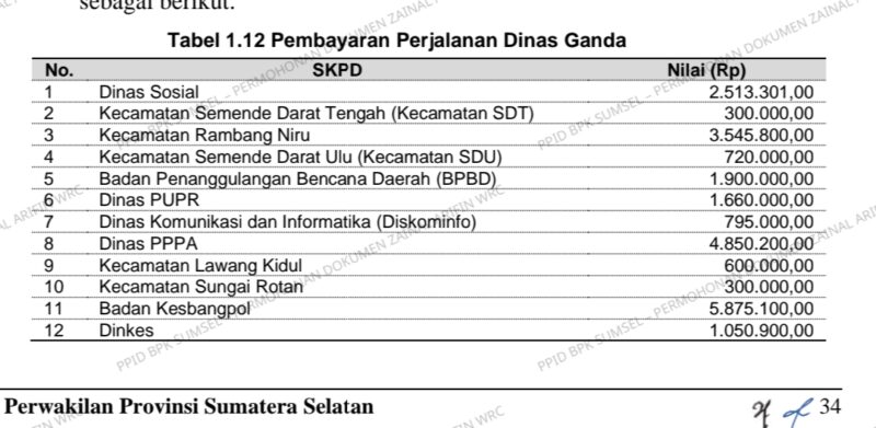 Pesatnya perkembangan oknum pejabat korupsi di seputar pemkab Muara Enim Pasalnya Perjalanan Dinas Tidak Dilaksanakan ke Tempat Tujuan pada Enam SKPD sebesar Rp1.046.489.368,00