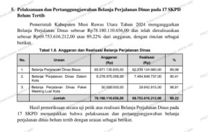 Ali Sopyan pimpinan umum media rajawali news mendesak pihak jajaran Tipikor Kajati Sumsel agar tidak mandul dalam menyikapi adanya kerugian ke Uangan negara . Pasalnya Pelaksanaan dan Pertanggungjawaban Belanja Perjalanan Dinas pada 17 SKPD Belum Tertib Pemerintah Kabupaten Musi Rawas Utara Tahun 2024 menganggarkan Belanja Perjalanan Dinas sebesar Rp78.180.110.656,00 dan telah direalisasikan sebesar Rp69.753.616.212,00 atau 89,22% dari anggaran, dengan rincian sebagai berikut.