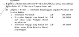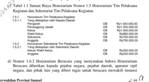 Pasalnya Berdasarkan hasil pemeriksaan terhadap bukti pertanggungjawaban berupa daftar hadir, notulen rapat kegiatan diketahui terdapat pertanggungjawaban belanja yang tidak sesuai ketentuan yaitu kesalahan penetapan jumlah volume OJ narasumber dan pembayaran honorarium narasumber melebihi SBU Pemprov Sumsel pada tiga SKPD sebesar Rp236.000.000,00 pada BPSDMD, RSUD Siti Fatimah, dan Dinas Perhubungan dengan rincian sebagai berikut.