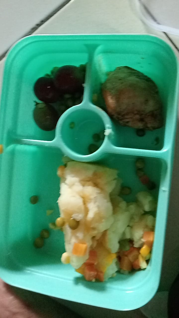Di sekat bawah terdapat kentang tumbuk yang dicampur dengan potongan wortel, jagung, dan kacang polong dalam wadah tersebut.