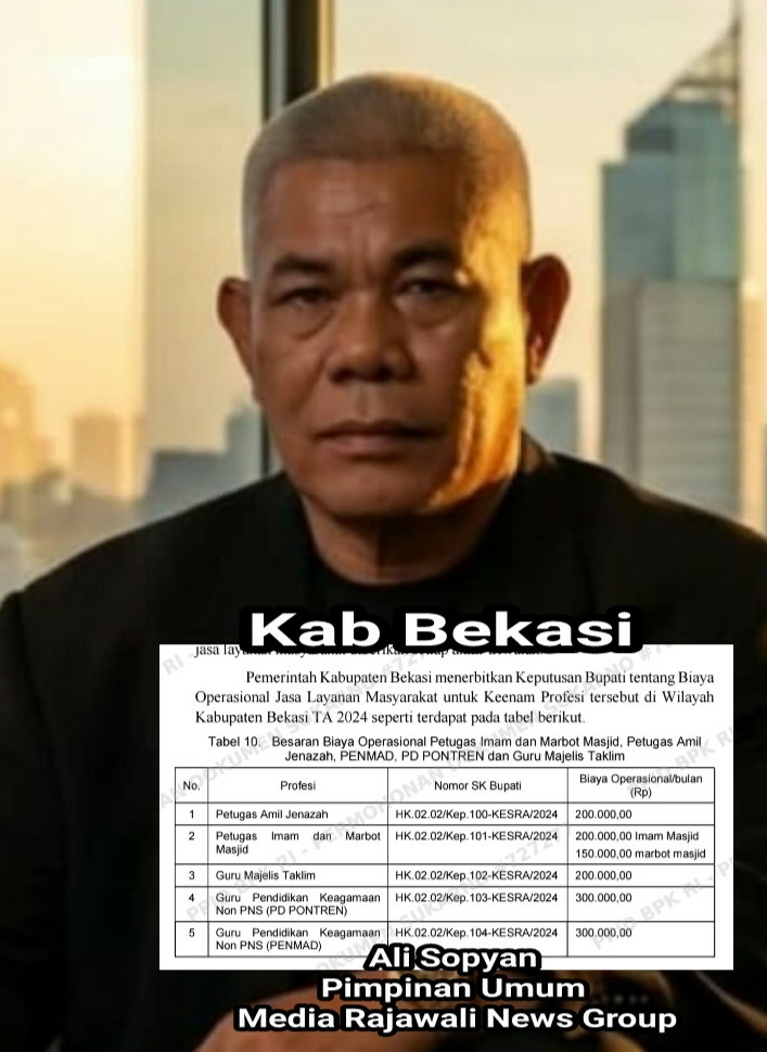 b. Keputusan Bupati Nomor HK.02.02/Kep.100 s.d. 104-KESRA/2024 tanggal 17 Januari 2024 tentang Biaya Operasional Jasa Layanan Masyarakat untuk enam Profesi di Wilayah Kabupaten Bekasi TA 2024 bahwa biaya operasional diberikan sebagai bentuk apresiasi Pemerintah Kabupaten Bekasi kepada Petugas Imam dan Marbot Masjid, Petugas Amil Jenazah, Guru Pendidikan Keagamaan Non PNS, Guru Pendidikan Keagamaan Non PNS dan Guru Majelis Taklim dipandang perlu diberikan Biaya Operasional atas Jasa Layanan kepada masyarakat.