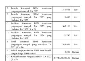 Penggunaan BBM Non Subsidi untuk kendaraan pengangkut sampah tersebut menambah beban APBD karena harga BBM Non Subsidi lebih tinggi sebesar Rp3.172.629.200,00 dengan perhitungan sebagai berikut.