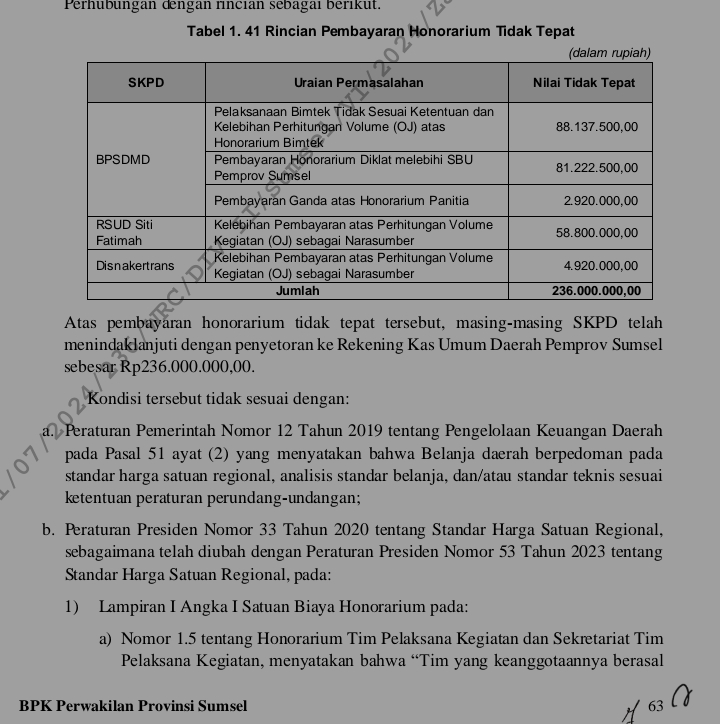 Berdasarkan hasil pemeriksaan terhadap bukti pertanggungjawaban berupa daftar hadir, notula rapat kegiatan diketahui terdapat pertanggungjawaban belanja yang tidak sesuai ketentuan yaitu kesalahan penetapan jumlah volume OJ narasumber dan pembayaran honorarium narasumber melebihi SBU Pemprov Sumsel pada tiga SKPD sebesar Rp236.000.000,00 pada BPSDMD, RSUD Siti Fatimah, dan Dinas Perhubungan dengan rincian sebagai berikut.