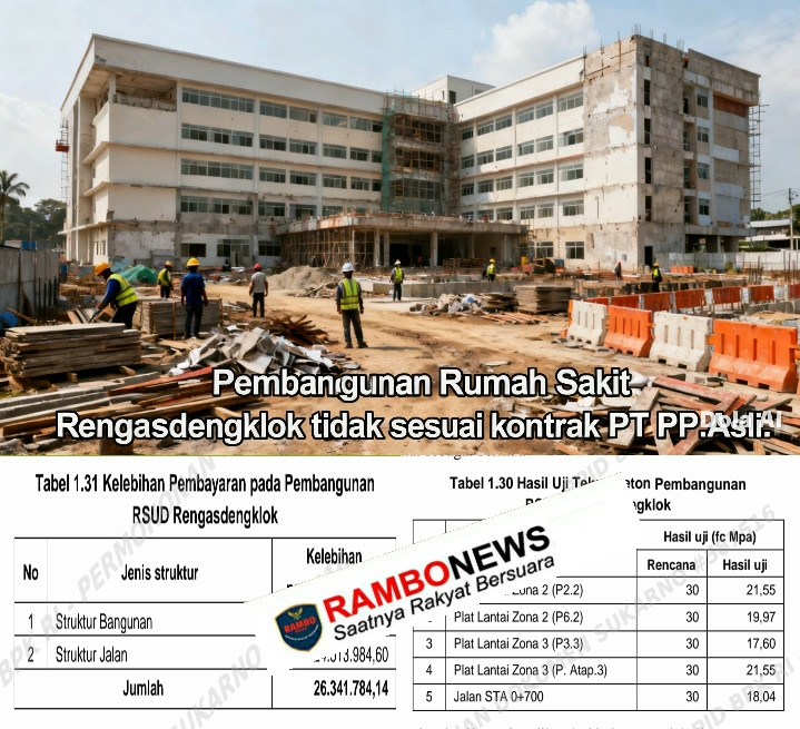 Masih saja , terjadi di pembangunan Rumah Sakit Rengasdengklok Diduga tidak sesuai kontrak dilaksanakan PT PP yang mengakibatkan kerugian uang negara.