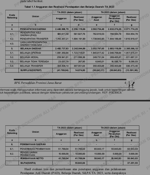 dana transfer sebesar Rp9.374.277.486,00 yang telah digunakan tidak sesuai peruntukannya ditindaklanjuti dengan melakukan rekonsiliasi dengan KPPN atas DAK Fisik, sedangkan untuk DAK non fisik, DBHCHT, dan DID sedang dalam proses permohonan rekonsiliasi ke DJPK Kemenkeu. Sampai dengan pemeriksaan berakhir, rekomendasi tersebut belum sepenuhnya selesai ditindaklanjuti. Pada pemeriksaan atas LKPD TA 2023 masih ditemukan permasalahan Kas Ditentukan Penggunaannya yang digunakan tidak sesuai peruntukannya yaitu sisa Dana Alokasi Umum (DAU) yang ditentukan penggunaannya (spesific grant) atau disingkat DAU-SG. Selain itu, terdapat permasalahan dalam penganggaran Pendapatan Daerah dan Belanja Daerah termasuk pelaksanaanya serta pengelolaan Kas Daerah dan Utang Jangka Pendek. Data anggaran dan realisasi Pendapatan dan Belanja Daerah TA 2023 (audited) disajikan pada tabel berikut.